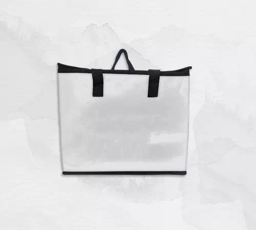 ExtĂ©rieur polypropylène non tissĂ© pelliculĂ© – IntĂ©rieur PEVA blanc | Fermeture par double ZIP | Deux anses courtes en polypropylène tressĂ© | Une face libre pour l’impression