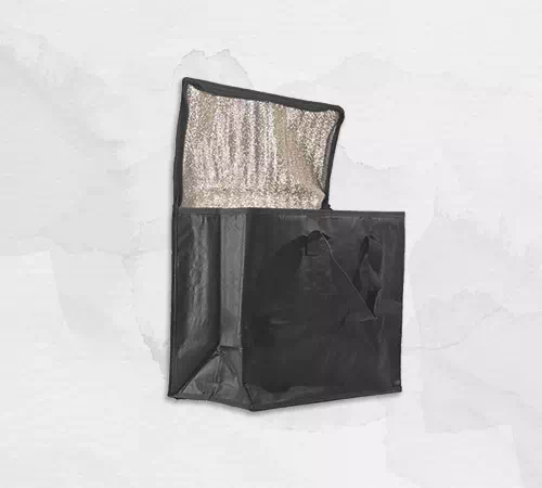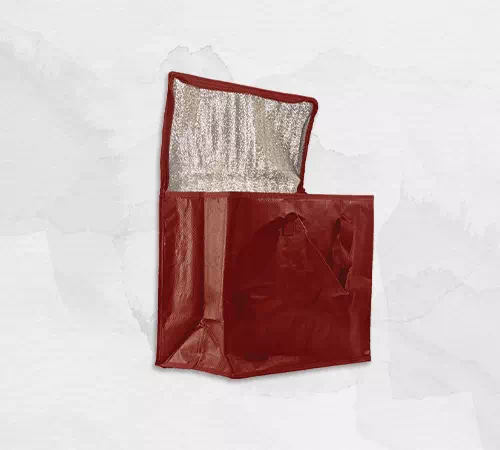 Extérieur polypropylène tissé – Intérieur mousse polyéthylène | Doublure aluminium – Fermeture par double ZIP | Deux anses courtes en polypropylène tressé | Une face libre pour l’impression