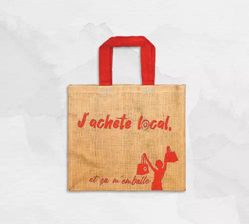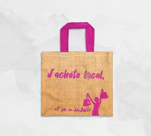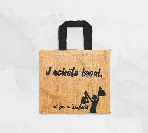 Jute et coton | Intérieur non laminé | Deux anses courtes en coton tressé, coloris assorti au visuel | Une face libre pour l’impression | Sac avec illustration